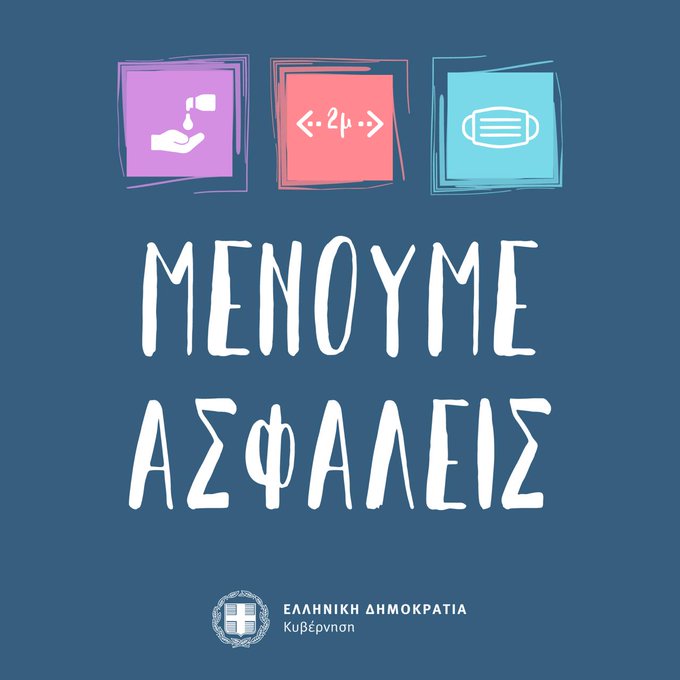 Χέρια (πλένουμε), Αποστάσεις (κρατάμε), Μάσκες (φοράμε)! Τηρούμε τα μέτρα ατομικής υγιεινής και προστασίας, μένουμε υπεύθυνοι, μένουμε ασφαλείς!»