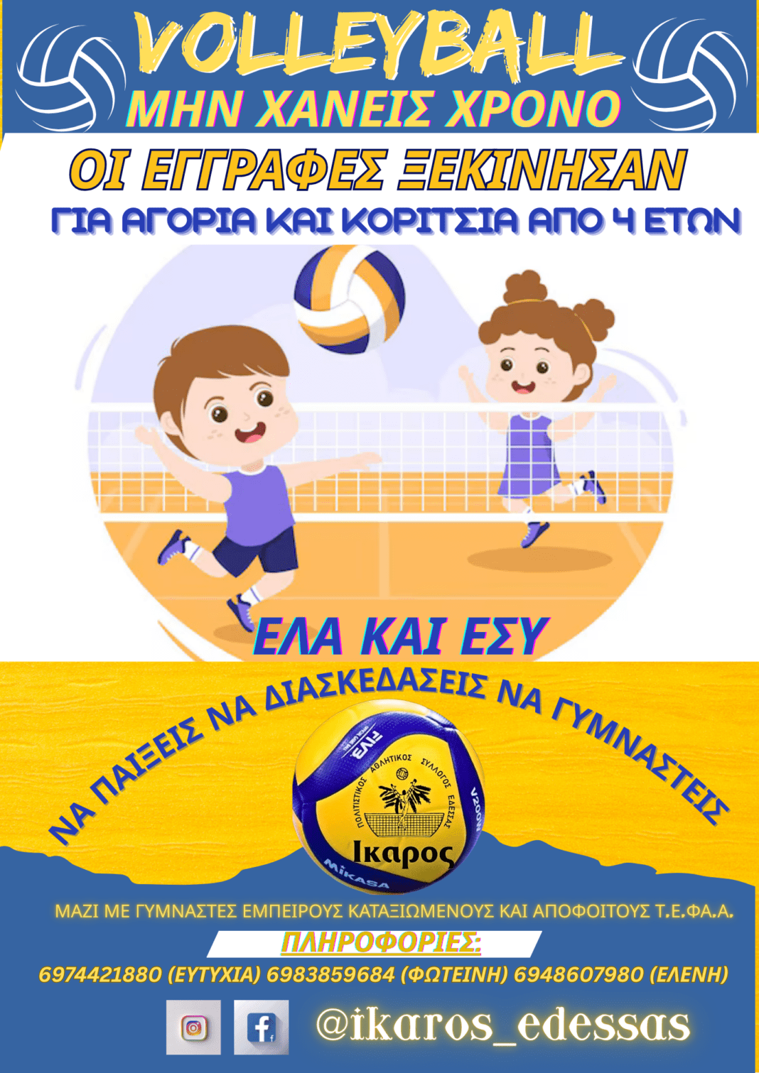 Η ομάδα βόλεϊ Π.Α.Σ. Ίκαρος Έδεσσας ανακοινώνει την έναρξη των εγγραφών για τη νέα αγωνιστική περίοδο 2025-2026.