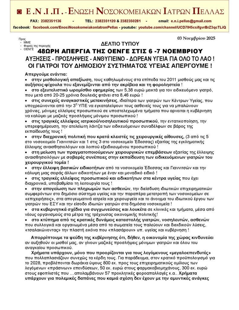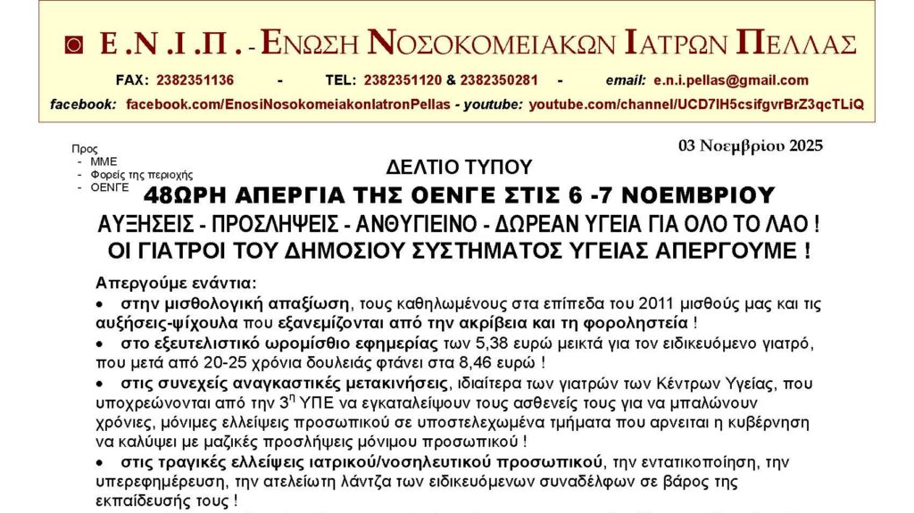 Αρχική Ειδήσεις 48ωρη κλαδική απεργία της Ομοσπονδίας Ενώσεων Νοσοκομειακών Ιατρών Ελλάδας στις 6 και...Ειδήσεις48ωρη κλαδική απεργία της Ομοσπονδίας Ενώσεων Νοσοκομειακών Ιατρών Ελλάδας στις 6 και 7 Νοέμβρη.Από Λεωνίδας Τούσιας - 5 Νοεμβρίου 2025Facebook Twitter ΠΑΡΟΜΟΙΑ ΑΡΘΡΑΠΕΡΙΣΣΟΤΕΡΑ ΑΠΟ ΤΟΝ ΔΗΜΙΟΥΡΓΟ ΕιδήσειςΈφτασε στην περιοχή μας, ο Βρετανός μέλος της ΔΙΕΘΝΗΣ ΕΝΩΣΗΣ ΑΣΤΥΝΟΜΙΚΩΝ / Ι.Ρ.Α. Μ.ΒΡΕΤΑΝΙΑΣ, κ. Alex Williams, που υπηρετεί στην Αστυνομία του Λονδίνου Ειδήσεις«Ψήφισμα του Δημοτικού Συμβουλίου Σκύδρας για τη συνέχιση της λειτουργίας του καταστήματος ΕΛΤΑ Σκύδρας» ΕιδήσειςΔάνης Τζαμτζής: «Η συντήρηση, καθαρισμός και εξωραϊσμός των οδικών υποδομών είναι δράσεις ασφάλειας, αλλά και πολιτισμού»