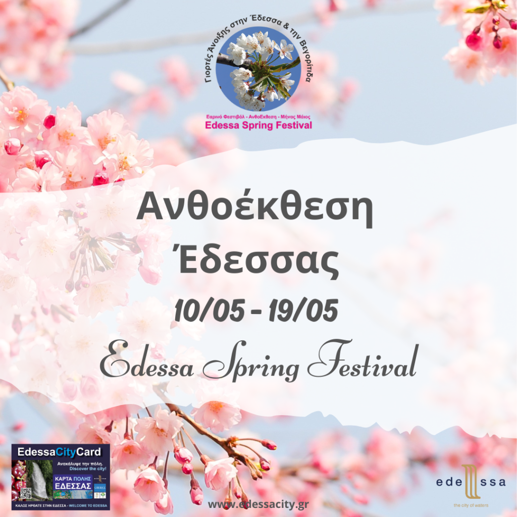 Η Άνοιξη στην Έδεσσα με τις ανθισμένες κερασιές είναι μοναδική και την έχει αποτυπώσει ο Μενέλαος Λουντέμης ως το σκαλοπάτι όπου πατά ο θεός για να ανέβει στον ουρανό. Η Άνοιξη της Έδεσσας γιορτάζει. Με σήμα την ανθισμένη κερασιά το Εαρινό φεστιβάλ μουσικής, η Ανθοέκθεση Έδεσσας και ο Εικαστικός Μήνας Μάιος συνθέτουν την πολύχρωμη πρόταση της Έδεσσας ανοιχτή για όλους τους επισκέπτες.