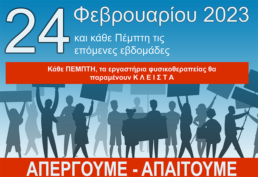 Την έναρξη απεργιακών κινητοποιήσεων, την Παρασκευή 24 Φεβρουαρίου 2023, αποφάσισε το Κεντρικό Διοικητικό Συμβούλιο του Πανελληνίου Συλλόγου Φυσικοθεραπευτών – Π.Σ.Φ. ΝΠΔΔ. Οι Φυσικοθεραπευτές δηλώνουν αποφασισμένοι να συνεχίσουν τις απεργιακές κινητοποιήσεις και τις επόμενες εβδομάδες, διεκδικώντας βιώσιμη σχέση με τον ΕΟΠΥΥ. Έτσι, την προσεχή Παρασκευή και από την επόμενη εβδομάδα, κάθε Πέμπτη, τα Εργαστήρια Φυσικοθεραπείας θα παραμένουν κλειστά. Με την κινητοποίησή τους, οι Φυσικοθεραπευτές ζητούν την κατάργηση των μέτρων rebate και clawback, που επιβλήθηκαν στους παρόχους υπηρεσιών Υγείας την περίοδο εφαρμογής των μνημονίων και αύξηση της δαπάνης φυσικοθεραπείας σύμφωνα με τις πραγματικές ανάγκες. Δέκα μαύρα χρόνια βιώνουν οι φυσικοθεραπευτές, εξαιτίας της εφαρμογής των ληστρικών μέτρων rebate και clawback. Έχουμε ήδη επιστρέψει στο κράτος πλέον των 230 εκατομμυρίων ευρώ από υπηρεσίες που παρείχαμε σε ασφαλισμένους του ΕΟΠΥΥ. Η κατάσταση αυτή δεν πάει άλλο. Οι φυσικοθεραπευτές στο σύνολό τους αντιμετωπίζουν προβλήματα επιβίωσης, οι μικρομεσαίοι όμως επαγγελματίες βρίσκονται στο χείλος της καταστροφής.