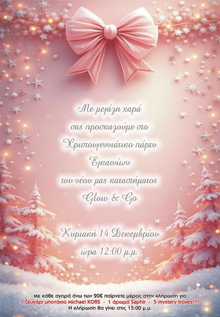 Με μεγάλη χαρά σας προσκαλούμε στο Χριστουγεννιάτικο πάρτι εγκαινίων του νέου μας καταστήματος Glow & Go την Κυριακή 14 Δεκεμβρίου και ώρα: 12:00 μ.μ. στην οδό Αρχελάου 3 στην Έδεσσα