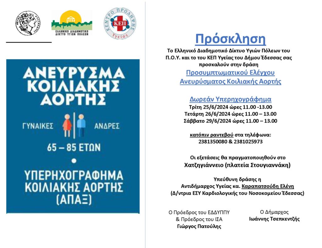 Το Ελληνικό Διαδημοτικό Δίκτυο Υγιών Πόλεων του Π.Ο.Υ. και το του ΚΕΠ Υγείας του Δήμου Έδεσσας σας προσκαλούν στην Δράση Προσυμπτωματικού Ελέγχου Ανευρύσματος Κοιλιακής Αορτής