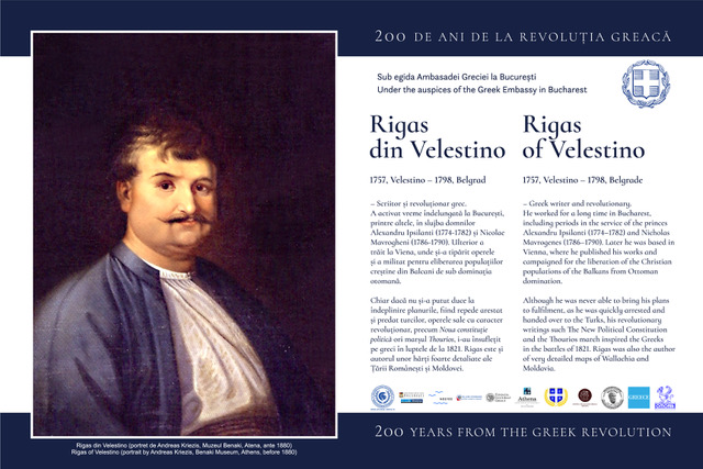 Με αφορμή τα 200 χρόνια από την έναρξη της Ελληνικής Επανάστασης του 1821 και με πρωτοβουλία του Πολιτιστικού Συλλόγου Ελλήνων Ρουμανίας «ΝΟΣΤΟΣ», υπό την αιγίδα της Πρεσβείας της Ελλάδος στο Βουκουρέστι και υπό την καθοδήγηση του καθηγητή Dr Tudor Dinu από το Πανεπιστήμιο του Βουκουρεστίου, πραγματοποιείται η έκθεση «Προσωπικότητες Ελλήνων που έπαιξαν ρόλο στην ιστορία των Ρουμάνων από την αρχαιότητα έως και σήμερα».