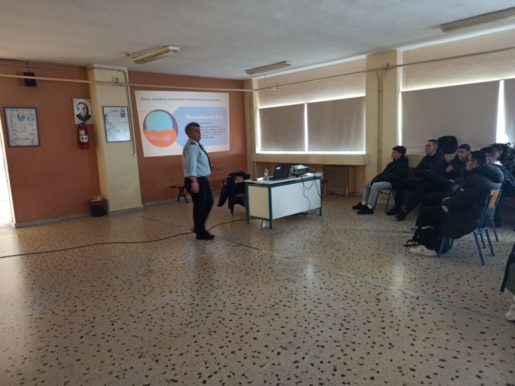 Στα πλαίσια του προγράμματος του Υπουργείου Παιδείας Δεξιότητες Μαθητών και ειδικότερα Ενημέρωση για την Οικογενειακή Βία, έγινε την προηγούμενη εβδομάδα, ομιλία για την οικογενειακή βία στο Σχολείο μας. Συγκεκριμένα έγινε δράση -ενημέρωση των μαθητών της κάθε τάξης (μια τάξη ανά ημέρα) του Σχολείου, για το μείζον πρόβλημα της εποχής μας, την ενδοοικογενειακή βία, από την Υπαστυνόμο Παυλίδου Μαρούλα , της Αστυνομικής Διεύθυνσης Πέλλας. Στην ενημέρωση παρουσιάστηκαν και αναλύθηκαν από την Υπαστυνόμο οι πτυχές του σημαντικού αυτού προβλήματος, καθώς και τρόποι αποφυγής του αλλά και αντιμετώπισής του.