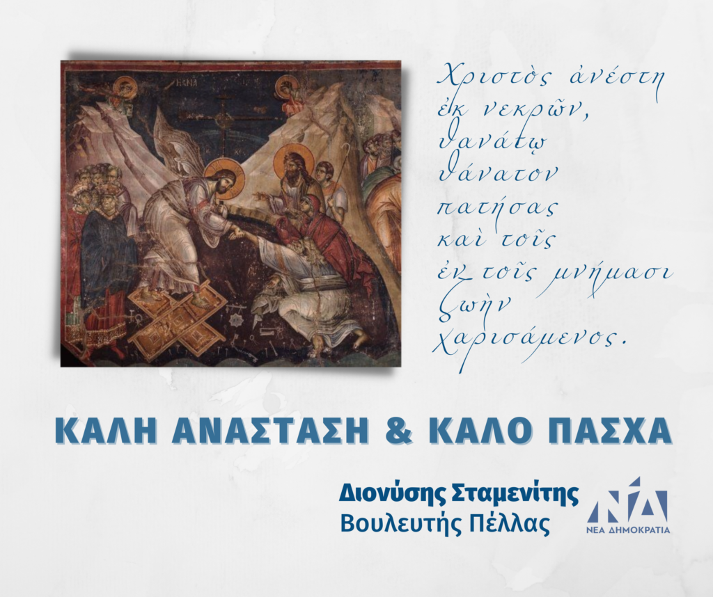 Οι Έλληνες σε ολόκληρο τον κόσμο γιορτάζουμε το Άγιο Πάσχα, αντλώντας δύναμη και αισιοδοξία από την πίστη μας.Η Ανάσταση του Κυρίου είναι το αιώνιο μήνυμα νίκης της ζωής, επικράτησης του φωτός και ανανέωσης της ελπίδας.Εύχομαι ολόψυχα υγεία, αγάπη & δύναμη, με προσωπική και οικογενειακή ευτυχία! Καλή Ανάσταση και καλό Πάσχα!
