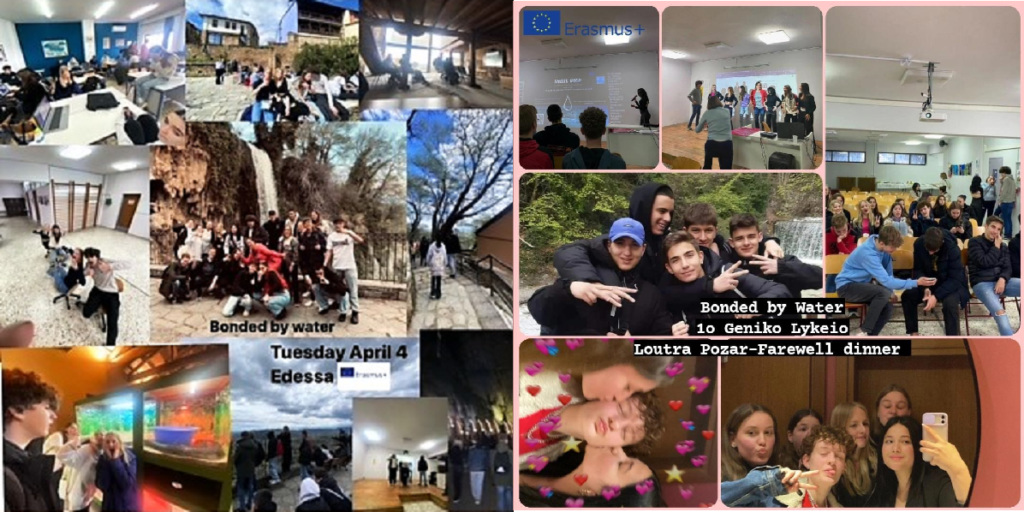 Συγκεκριμένα κατά τη διάρκεια αυτής της επίσκεψης στην Έδεσσα, οι μαθητές συμμετείχαν σε εργαστήρια με θέματα όπως “eSafety”, ““Exploring shapes of water” και “Speak your Mind” όπου ενημερώθηκαν για την ορθή χρήση του διαδικτύου, διερεύνησαν ποια είναι τα προβλήματα που αντιμετωπίζουμε σχετικά με τη βιωσιμότητα των υδάτινων πόρων και τις συνέπειες της σωστής η μη διαχείρισης του νερού στον ανθρώπινο οργανισμό. Κατόπιν εργάστηκαν σε ομάδες νέων ακτιβιστών και οργάνωσαν σχετικές δράσεις ευαισθητοποίησης του κοινού (συναυλίες, θεατρική παράσταση, έκθεση και εορτασμό της Παγκόσμιας Ημέρας Νερού), δημιουργώντας αφίσες για να τις προωθήσουν και να τις διαφημίσουν. Επίσης εφάρμοσαν τεχνικές κιναισθητικής σε συνδυασμό με ακουστικές τεχνικές για τη δημιουργία ενός πολυαισθητηριακού περιβάλλοντος μάθησης έτσι ώστε να επιτευχθεί βαθύτερη κατανόηση του θέματος χρησιμοποιώντας το ανθρώπινο σώμα.