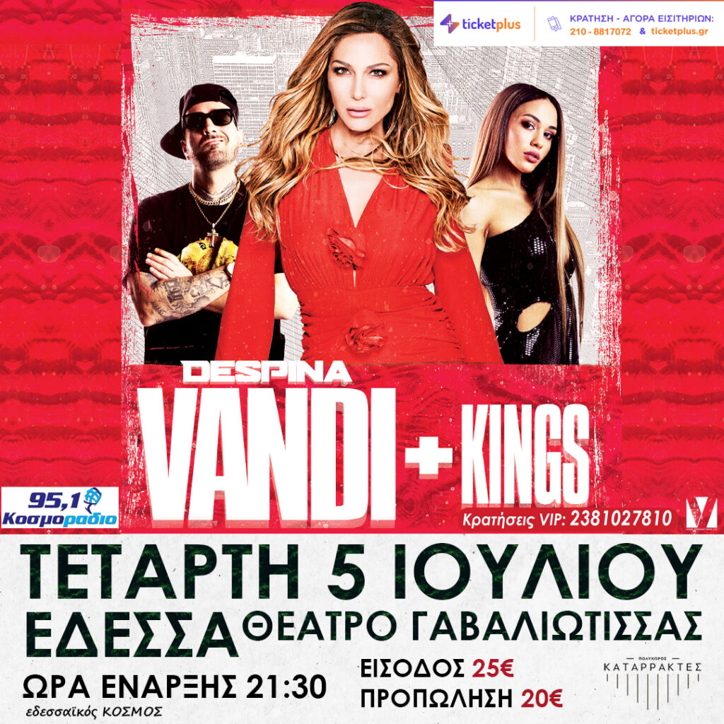 Ο Πολυχώρος Καταρράκτες παρουσιάζει την Δέσποινα Βανδή και τους Kings στο μεγαλύτερο live concert του καλοκαιριού την Τετάρτη 5 Ιουλίου στο Θέατρο Γαβαλιώτισσας Έδεσσα