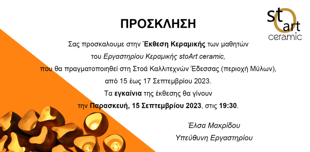 Το Εργαστήρι Κεραμικής “stoART Ceramic” της Έλσας Μακρίδου πραγματοποιεί ομαδική έκθεση κεραμικής στη Στοά Καλλιτεχνών, στην περιοχή των Μύλων της Έδεσσας, όπου θα παρουσιαστούν δημιουργίες των μαθητών του τμήματος ενηλίκων και της ίδιας.