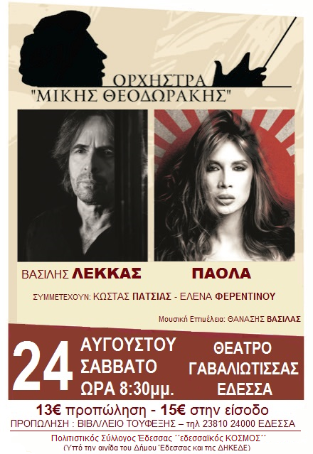 Πρόκειται για μία μεγαλειώδη συναυλία με την Λαϊκή Ορχήστρα «Μίκης Θεοδωράκης», έτοιμη να μας ταξιδέψει στα μαγικά μουσικά μονοπάτια του μεγάλου συνθέτη και που θα έχουμε την τιμή και την χαρά να υποδεχτούμε για πρώτη φορά στην πόλη της Έδεσσας. Παρόντες στην συναυλία θα είναι η κόρη του Μίκη Θεοδωράκη ,Μαργαρίτα, συνοδευόμενη από τον γιο της, εγγονό του συνθέτη.
