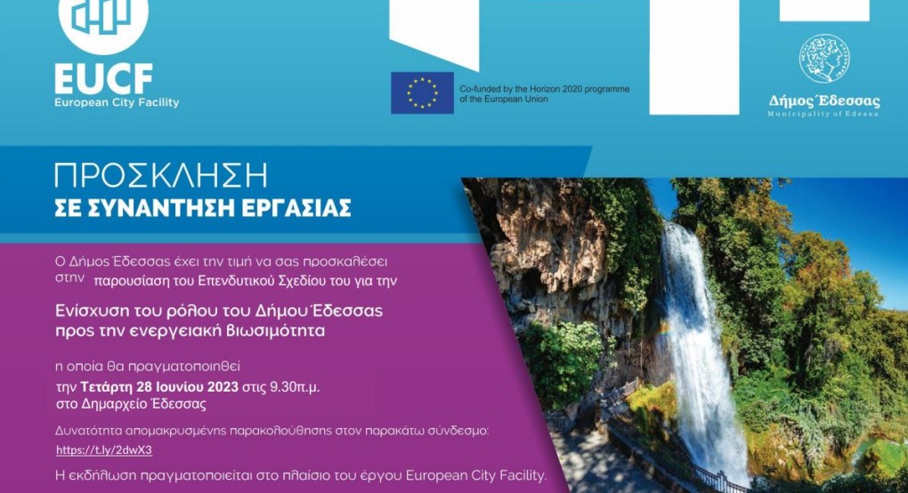 Ο Δήμος Έδεσσας στο πλαίσιο ολοκλήρωσης του Επενδυτικού του Σχεδίου για την ενίσχυση της πορείας του προς την ενεργειακή βιωσιμότητα στο πλαίσιο της ευρωπαϊκής πρωτοβουλίας European City Facility (EUCF) του προγράμματος Horizon 2020, διοργανώνει εκδήλωση διάχυσης των αποτελεσμάτων και δικτύωσης με ενδιαφερόμενους φορείς, την Τετάρτη 28 Ιουνίου 2023 και ώρα 9.30 π.μ. στο Δημαρχείο Έδεσσας.