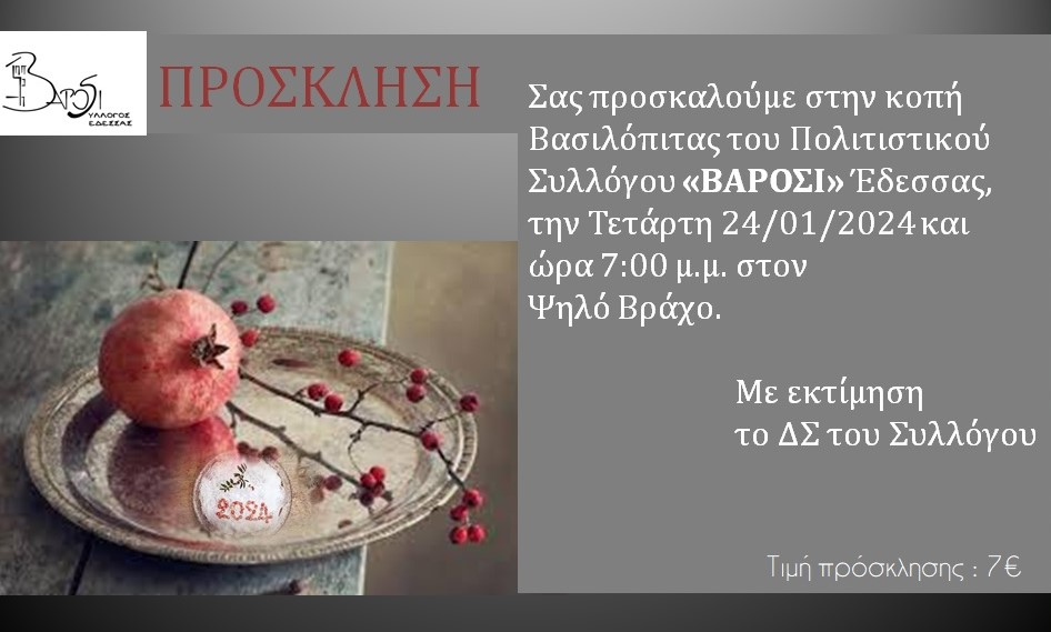 Το Δ.Σ. του Πολιτιστικού Συλλόγου «Βαρόσι» Έδεσσας καλεί τα μέλη, τις φίλες και τους φίλους του, στην Κοπή Βασιλόπιτας, την Τετάρτη 24 Ιανουαρίου 2024, ώρα: 7:00 μ.μ. στον «Ψηλό Βράχο»