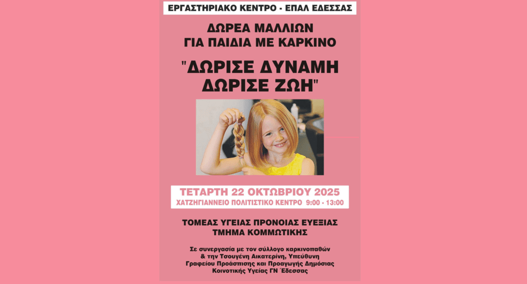 Το τμήμα Κομμωτικής του ΕΠΑΛ – Ε.Κ Έδεσσας διοργανώνει τη δράση «Δώρισε Δύναμη, Δώρισε Ζωή», τη Τρίτη 22 Οκτωβρίου στο Χατζηγιάννειο Πολιτιστικό Κέντρο Έδεσσας.