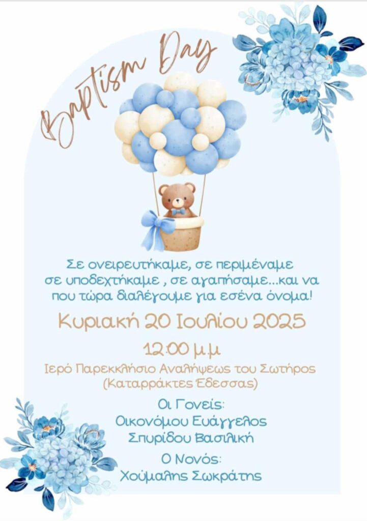 Σε μία άκρως συγκινητική και οικογενειακή τελετή, ο γιατρός Οικονόμου Ευάγγελος και η σύζυγος του Βασιλική Σπυρίδου, βάφτισαν τον μικρό τους πρίγκιπα στην Έδεσσα, με φόντο το πάρκο καταρρακτών, σε μια γαλήνια ατμόσφαιρα που ταίριαζε απόλυτα με το κλίμα της ημέρας.