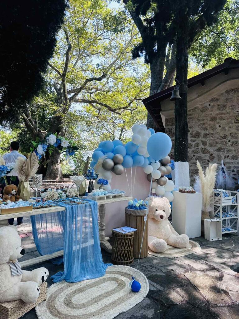 Ο στολισμός κινήθηκε σε γαλάζια αισθητική με λευκά και γαλάζια άνθη, χειροποίητες μπομπονιέρες και υφάσματα σε φυσικές υφές, δημιουργώντας μία αίσθηση αυθεντικής φιλοξενίας.