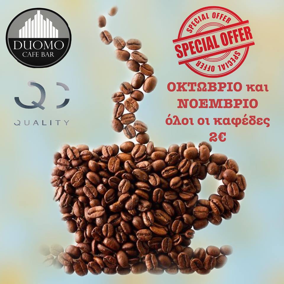 Το Duomo Café Bar μαζί με το Quality Coffee Bar για να ανταποδώσουν την αγάπη του κόσμου που τόσο καιρό τους στηρίζει, προσφέρουν για τους κρύους μήνες του Οκτωβρίου και του Νοεμβρίου »ΟΛΟΥΣ» τους καφέδες με 2 €.
