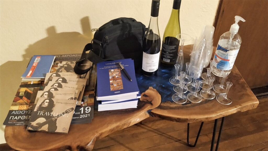 Η παρουσίαση διενεργήθηκε στο πλαίσιο της έκθεσης ζωγραφικής του Νίκου Ταμουτσέλη «Σημείο Ακρόασης», η οποία έχει ήδη ξεκινήσει από τις 8 Δεκεμβρίου και θα διαρκέσει μέχρι τις 19 του ιδίου μήνα. Αξίζει να αναφερθεί ότι ο Νίκος Ταμουτσέλης φιλοτέχνησε το εξώφυλλο του εν λόγω βιβλίου με το έργο του «Σημείο Ακρόασης», το οποίο αποτέλεσε το εφαλτήριο για τη δημιουργία μιας σειράς έργων και την έκθεσή τους.