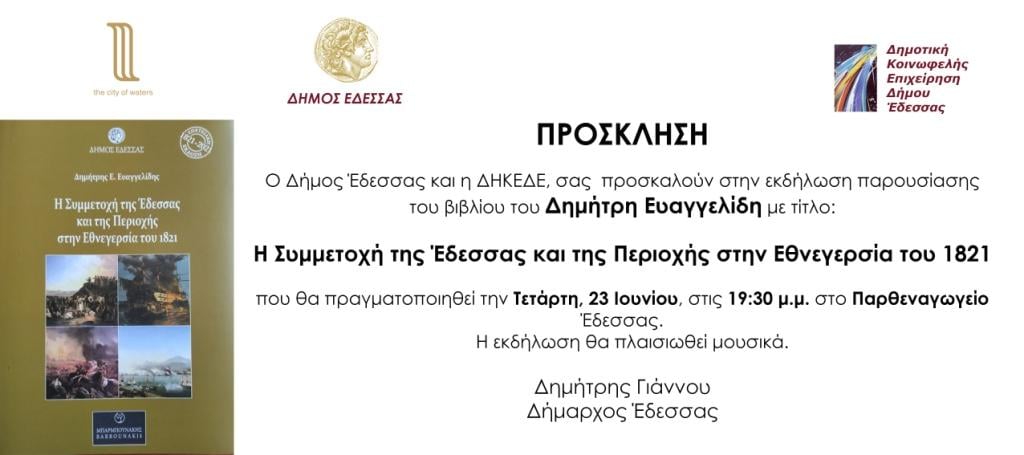 Την Τετάρτη, 23 Ιουνίου 2021, στις 19:30, στο Παρθεναγωγείο, θα πραγματοποιηθεί η παρουσίαση του βιβλίου του Δημήτρη Ευαγγελίδη, με τίτλο «Η Συμμετοχή της Έδεσσας και της Περιοχής στην Εθνεγερσία του 1821». Είναι ένα βιβλίο που εκδόθηκε από τον Δήμο Έδεσσας, ο οποίος διοργανώνει την εκδήλωση παρουσίασης μαζί με την Δημοτική Κοινωφελή Επιχείρηση (ΔΗΚΕΔΕ).