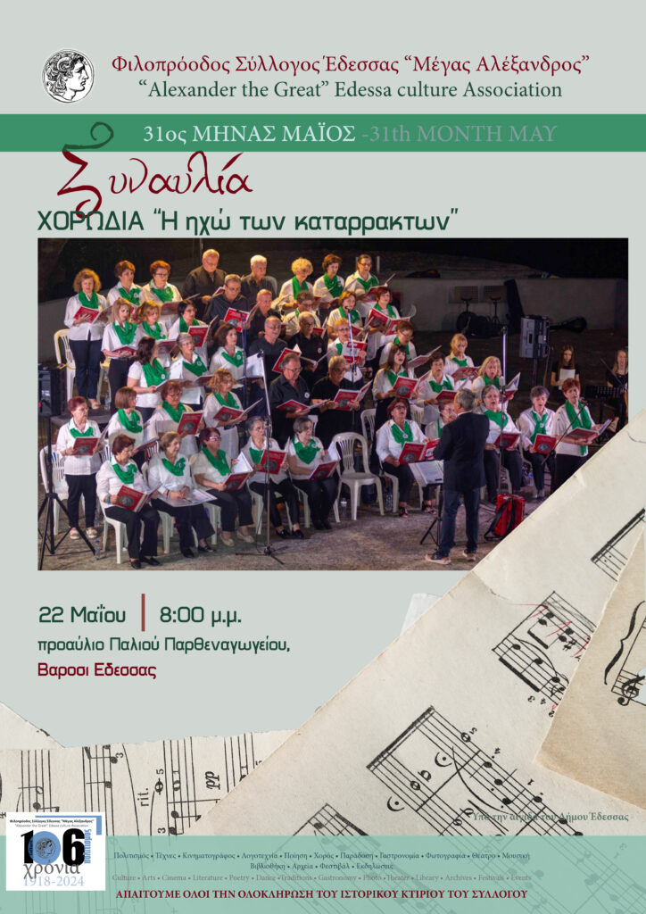 Η χορωδία του Φ.Σ.Ε. Μέγας Αλέξανδρος «Ηχώ των καταρρακτών» θα γεμίσει μελωδίες τον κήπο του Παρθεναγωγείου (Βαρόσι, Έδεσσα) την Τετάρτη 22 Μαΐου 2024 και ώρα 8 μ.μ.